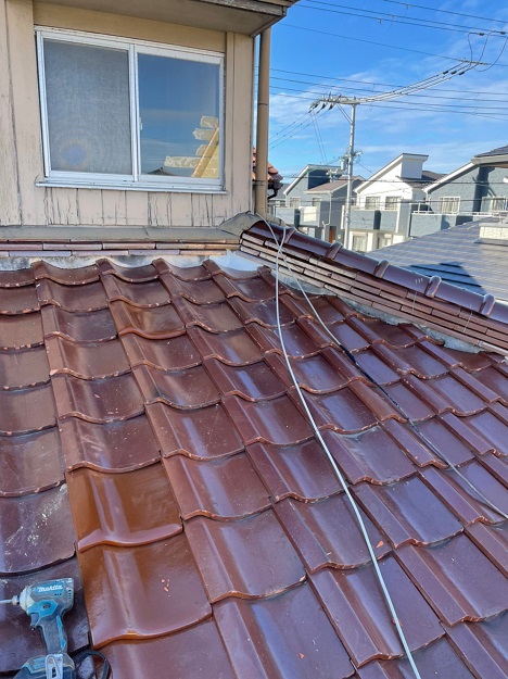 現地調査させて頂き、瓦落下箇所の他にも屋根全体の補修が必要でしたのでお客様のご相談し劣化のひどい箇所中心にメンテナンスをさせて頂いております(^^)/