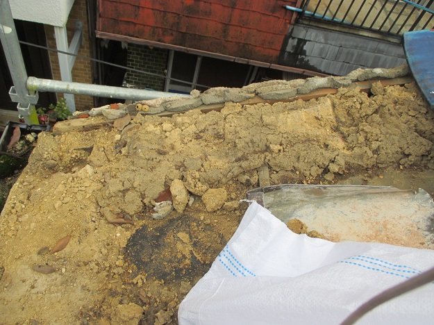 現地調査させていただいたところ、落下している箇所の下地が腐食しているのと屋根の状態もメンテナンスが必要であった為